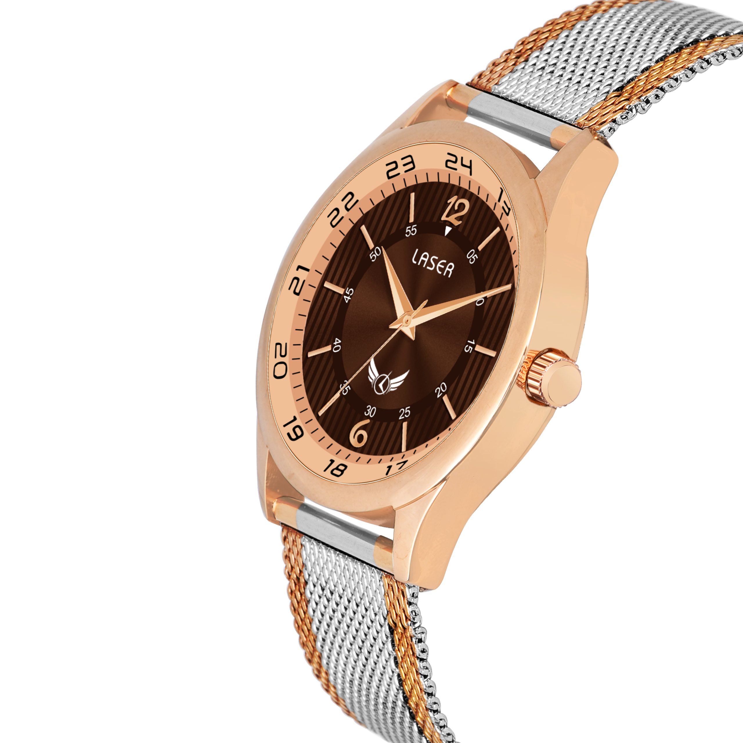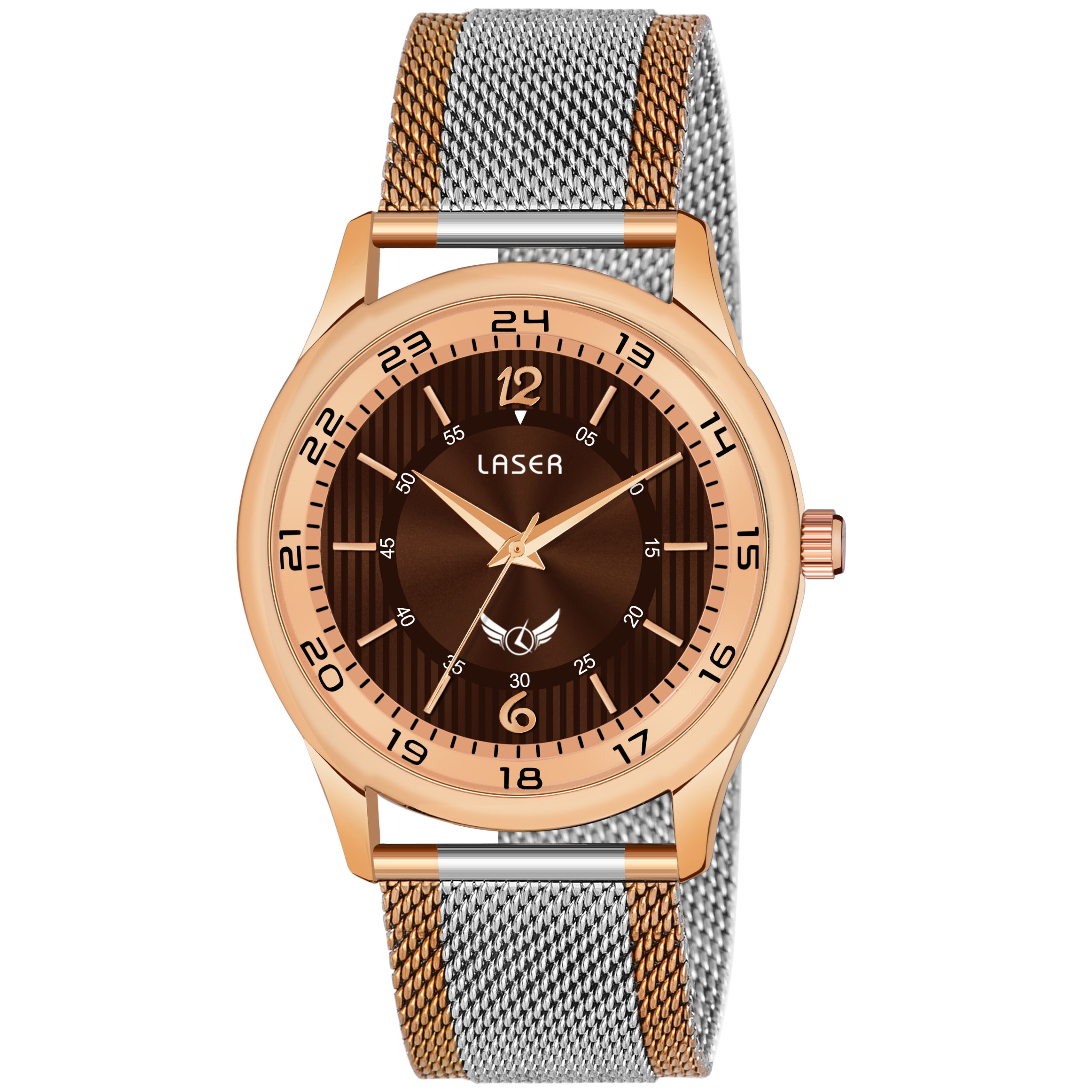 The Laser Men’s Watch offers a refined and contemporary design, featuring a striking rosegold case paired with a sleek silver-rosegold two-tone mesh chain. The warm brown dial adds depth and elegance, creating a sophisticated contrast against the metallic tones. Powered by a precise Japan Quartz movement, this watch ensures reliable timekeeping and long-lasting performance. Perfect for any occasion, whether formal or casual, the Laser Watch is an ideal accessory for men who appreciate high-quality craftsmanship, style, and functionality. Elevate your wrist game with this exceptional timepiece.